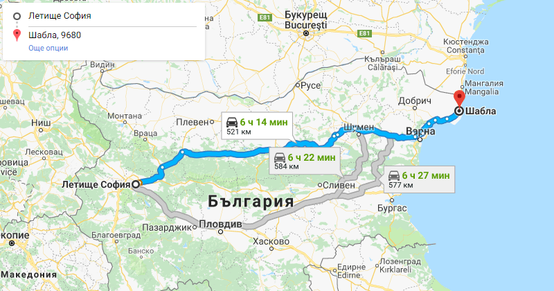 Transfer time from Sofia airport or city center to Shabla (or Shabla to Sofia) is shown on the map below. The duration between Sofia and Shabla is shown below on the map as well.