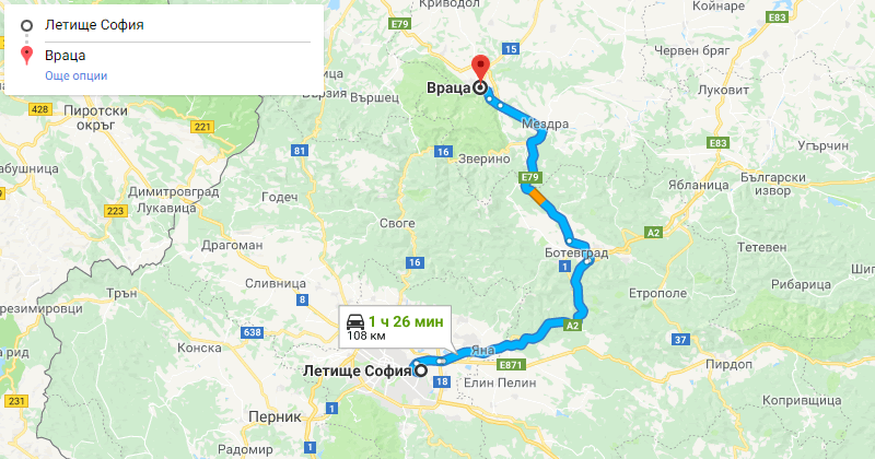 Transfer time from Sofia airport or city center to Vratsa (or Vratsa to Sofia) is shown on the map below. The duration between Sofia and Vratsa is shown below on the map as well.